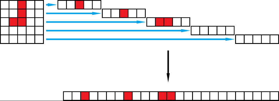 The outer layer of the depicted network contains 4 neurons, the intermediate layer contains 5 neurons, and the output layer contains only one neuron. The number of neurons in layers depends on what problem we are solving. Namely, the number of neurons in the input layer corresponds to the amount of information that we submit to the input. On the other hand, the number of neurons in the output layer corresponds to the amount of information that the computer must return. To explain this, let's look at the left of the two L shapes above. We can split the entire image into five stripes, and then connect them into one long strip of length 25: