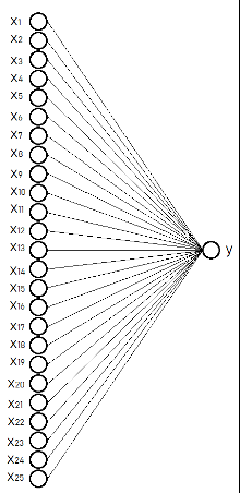 Now imagine that our function is described by the equation f(x1, ..., x25) = a1x1, ..., a25x25, with unknown coefficients a1, ..., a25 (of course in practice, we choose much more complicated equations).
